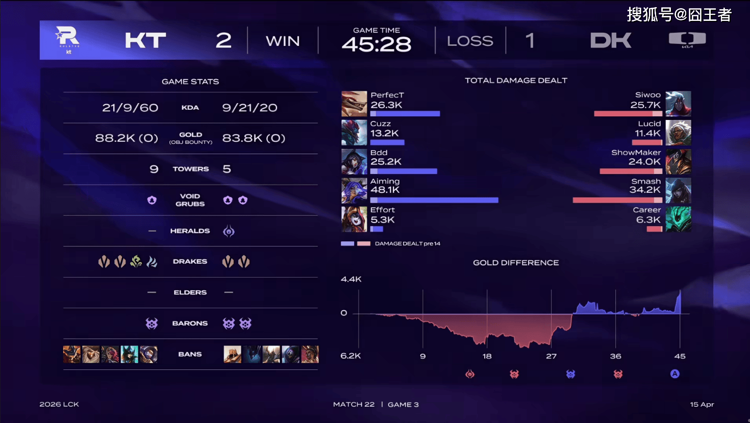 21分钟,小龙团DK打出0换2,随后拿下大龙;24分钟,DK中上被KT找到机会击杀;27分钟,KT在龙团打出0换4;29分钟,KT野区开团大获全胜,转头拿下大龙;33分钟,KT龙团开团,后续两边打出3换3;37分钟,DK拿下大龙,后续KT击杀韦鲁斯;39分钟,KT拿下龙魂,后续在野区抓死卡牌;最终45分28秒,KT团战大获全胜,随后顺利一波