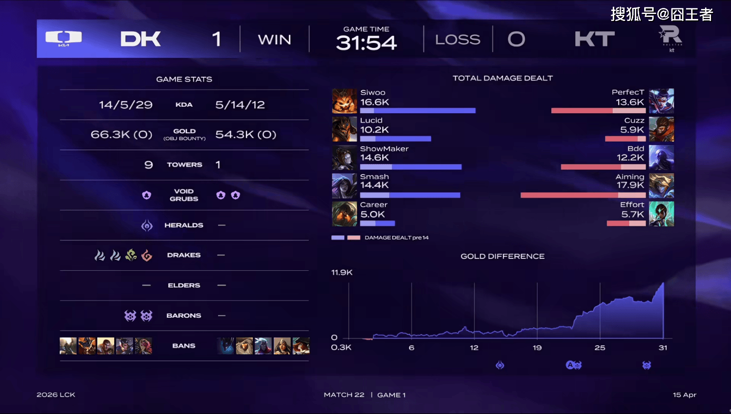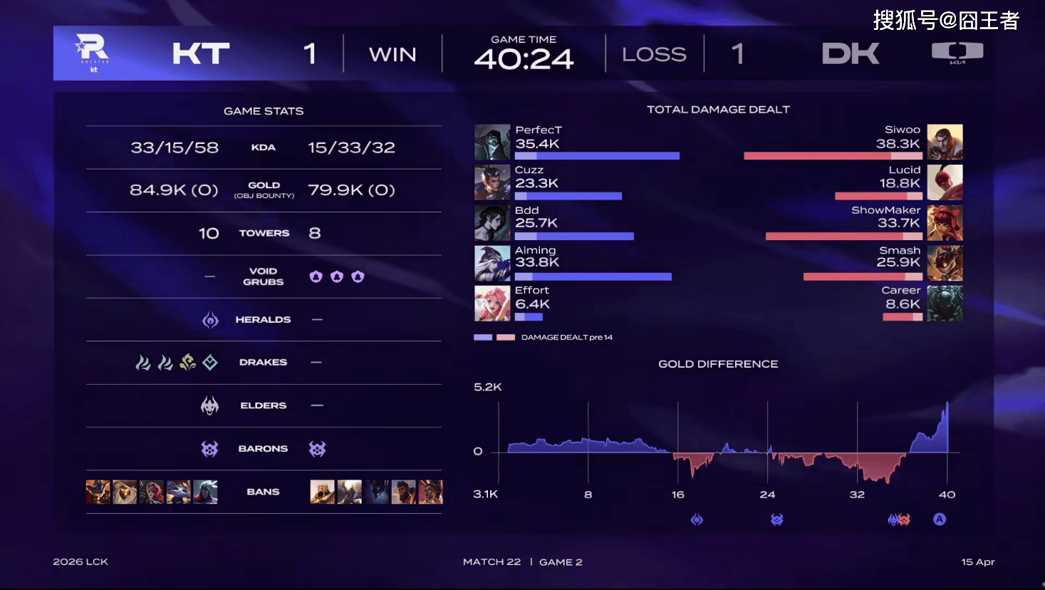 按照赛程安排,4月15日的赛程,由NS大战BFX,以及KT对阵DK组成。在率先结束的第一场比赛中,NS零封BFX;那么,DK和KT,这两支势头正盛的队伍,他们谁能获胜,就让赛场来告诉我们吧