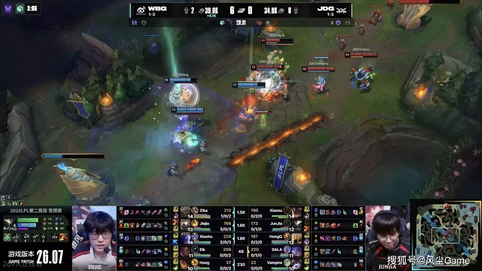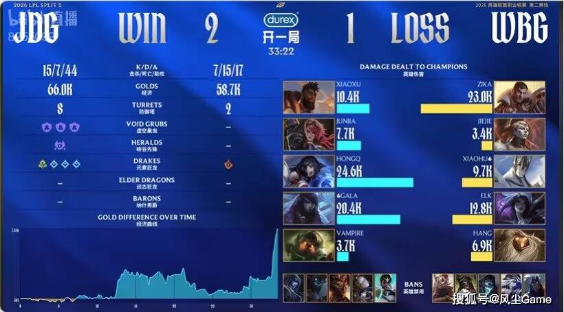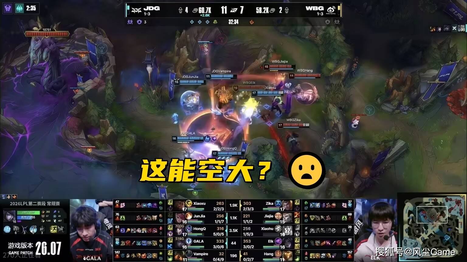 同一天的另一场比赛,是全华班大战,JDG和WBG这对难兄难弟,也是打满了三局,才分出胜负,这两队的比赛,是真的很下饭又墨迹,几乎每一把,都有人打出名场面,Hang的失误是最多的,第一把的米利欧,20分钟赵大哥上嘴脸清线被包夹,Hang一手提前大,把AD送对面嘴里。