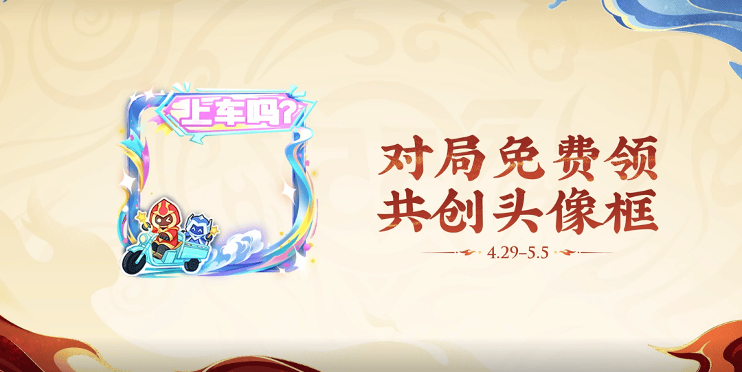 4月29日-5月5日,上线可以免费领取共创头像框“上车吗?”,头像框的主题是红方小兵开电动小三轮带蓝方小兵,看上去非常可爱!
