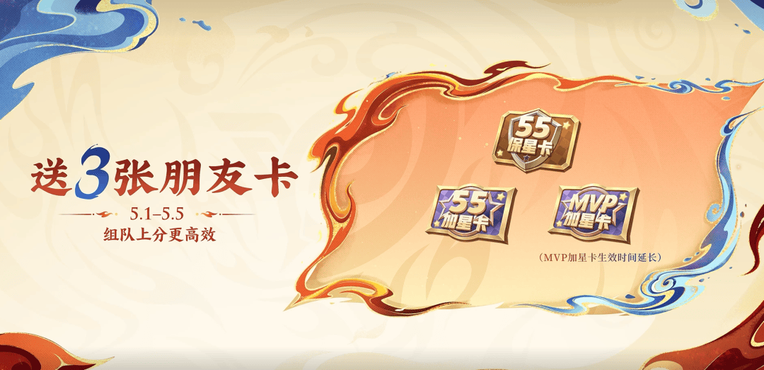 5月1日-5月5日,会有三张朋友卡出现,它们分别是55加星卡、55保星卡、Mvp加星卡,三卡出现将全方位为开黑玩家保驾护航。