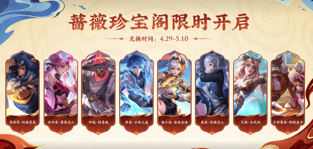 4.29日至5.10日,蔷薇珍宝阁限时开启,届时有数款皮肤供各位玩家挑选!