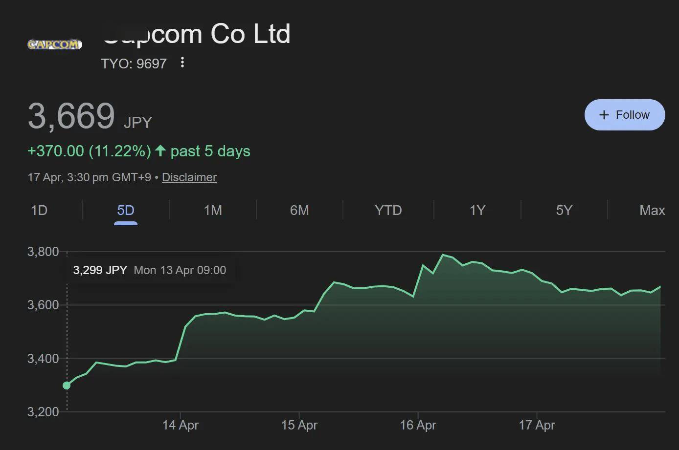 IT之家注意到,近 5 日数据显示,卡普空股价上涨 11%,涨幅达 370 日元,目前公司股价为每股 3669 日元。
