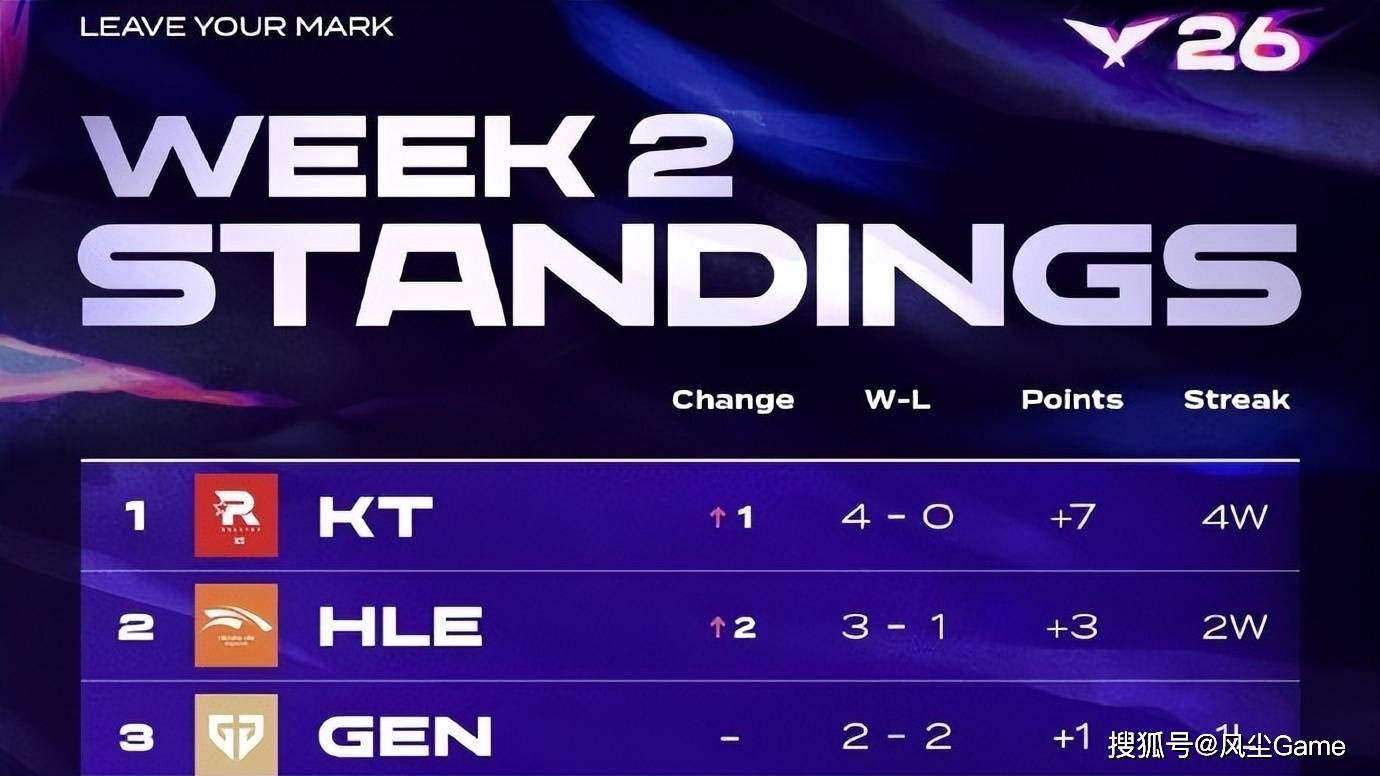 LCK第二赛段常规赛,在休赛两天后,即将打响第二周比赛,这个赛段的LCK,跟咱们赛区有点像,之前很强的队伍集体拉胯,GEN打了四场比赛输了2场,战绩和T1、DK、NS持平,而之前成绩不太好的KT和HLE,突然强势崛起,KT一波4连胜,直接登顶积分榜,HLE也打出3-1的战绩。