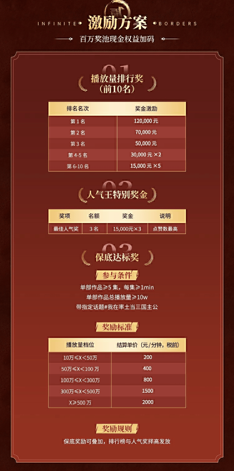 奖励方面,官方诚意十足:播放量排行第一名可获得12万元奖金,第二名7万元,第三名5万元,还设有最佳人气奖和保底达标奖——只要播放量达到10万以上,就能按分钟数获得现金激励,播放量越高,单分钟奖励越丰厚。