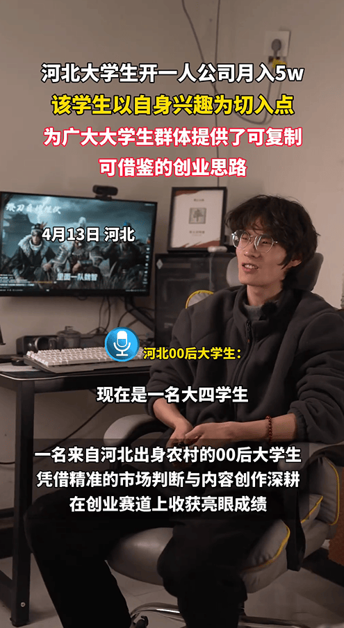4月13日,“河北大学生开一人公司月入5w”这个话题成功登上抖音热搜,直接冲上同城榜TOP3、社会榜TOP18,超过15万人同时在看,甚至触发了抖音AI摘要自动生成。话题的主角,正是《率土之滨》星推计划的创作者——“率土百特曼”。