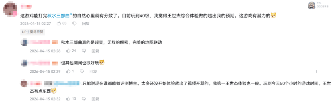 可以看到,大部分好评都聚焦到游戏的中后期内容:英雄支线剧情做得好,战斗还原度远超预期,世界观展开之后代入感变强。有玩家表示“一开始觉得也挺一般,打完秋水三部曲之后综合体验超预期,一上头直接玩了50个小时,只能说王世杰有点东西。”