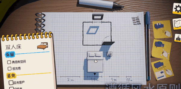 重点在于,游戏里每件家具的摆放,都需要尽可能的满足一系列和风水学有关的延伸条件。就比如一张双人床的位置,不仅需要满足“两侧留有空间”“背靠后方墙”,还需要尽量避免直接朝向门或者靠近后方窗户。