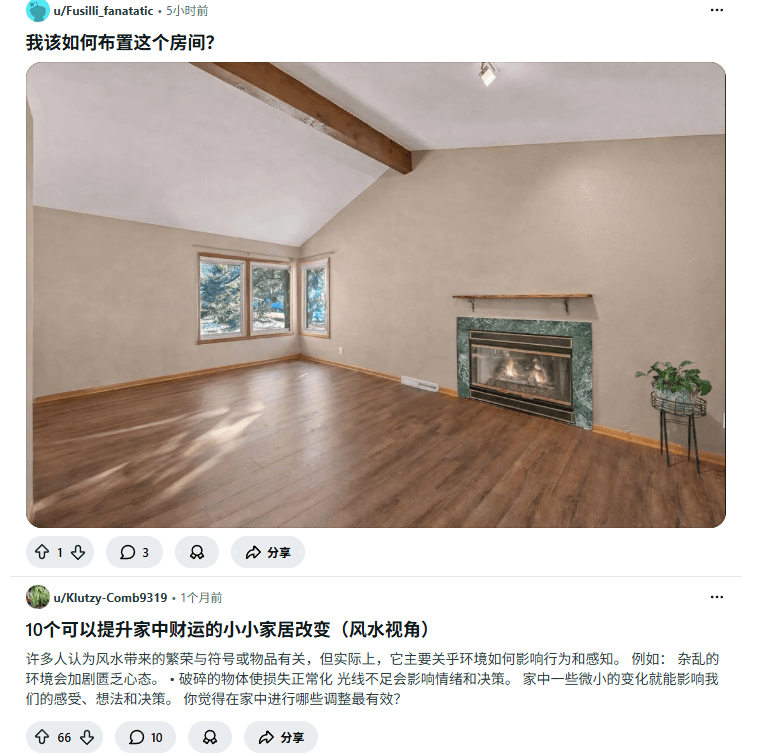 其实关于“风水”,国外同样有讨论度相当高的社区和论坛,(比如Reddit论坛的风水板块)网友聊到的更多是一些更实际的问题,比如“如何布置这个房型”,即使提到了“改变财运”这种概念,给出的往往也是“环境影响心态”这类更科学的解释。