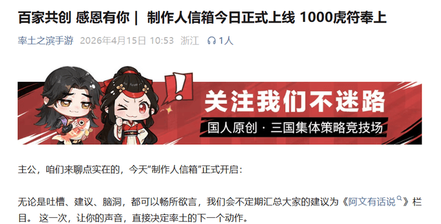 近日,《率土之滨》新晋制作人阿文就通过一封诚挚的公开信,不仅送出了1000虎符,更推倒了那堵存在已久的“沟通壁垒”。