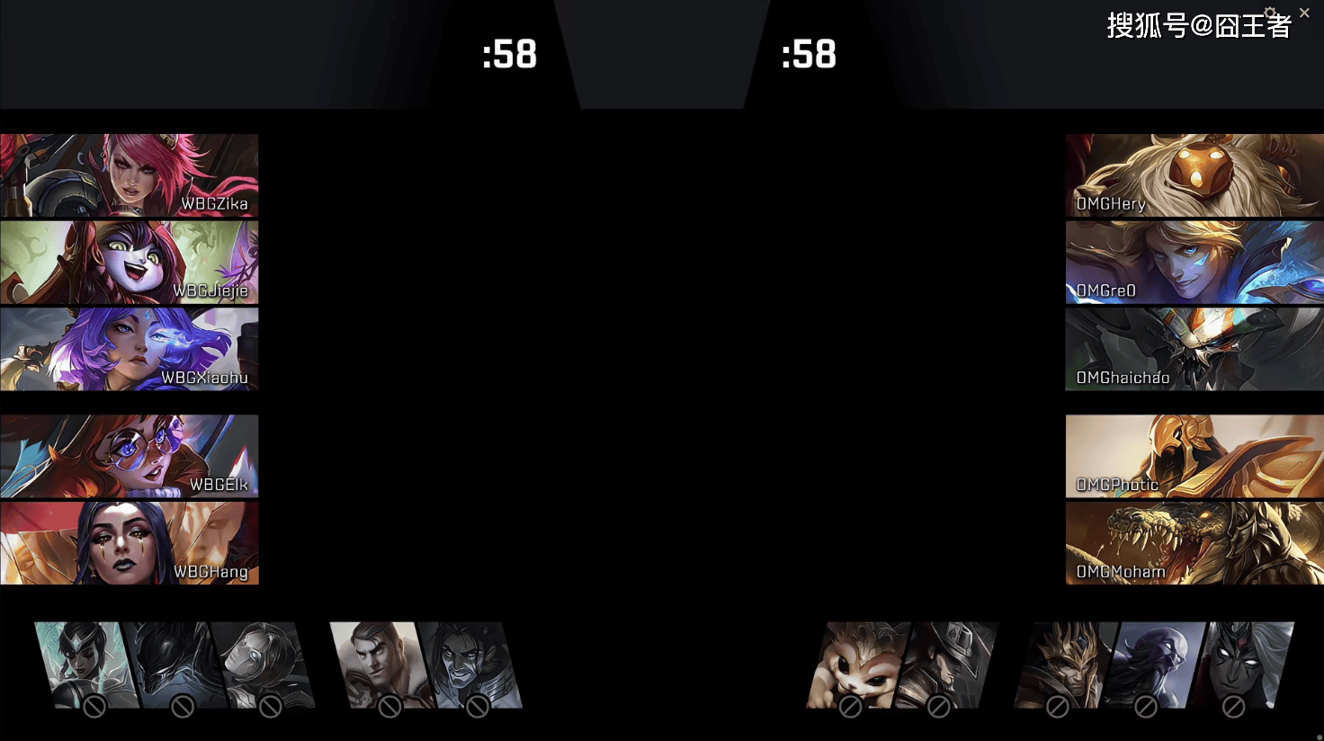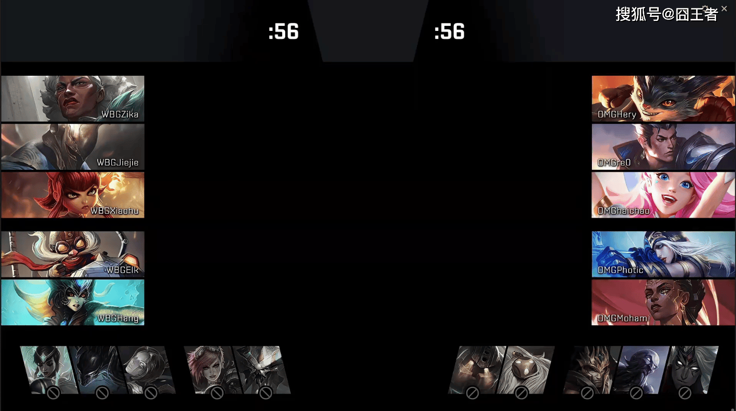 第一局比赛,WBG蓝色方,禁用:卡尔玛、梦魇、发条、蔚、蝎子,选用:Zika安蓓萨、Jiejie潘森、Xiaohu安妮、Elk飞机、Hang娜美;OMG红色方,禁用:韦鲁斯、瑞兹、皇子、巴德、泰坦,选用:Hery兰博、re0赵信、haichao梅尔、Photic艾希、Moham萨勒芬妮