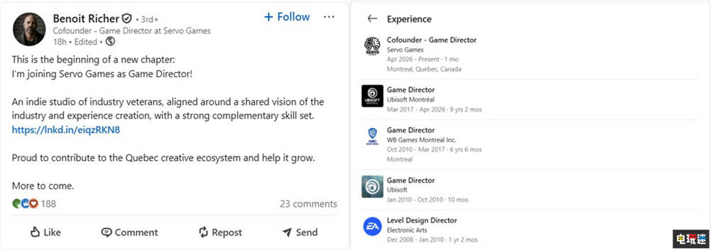 根据领英的履历显示,《刺客信条》“代号女巫”总监伯努瓦·里谢(Benoit Richer)已经离开育碧加入Servo Games担任游戏总监。他在今年1月份才上任“代号女巫”的游戏总监一职。如今他成为继创意总监克林特·霍金离职后,第二位离职的核心领导层。对于自己的跳槽,伯努瓦·里谢表示是“新篇章的开始”。克林特·霍金是在《刺客信条:黑旗》创意总监让·盖斯东担任Vantage Studios的《刺客信条》内容主管后离职,不知道伯努瓦·里谢离职是否也与育碧结构变动有关。