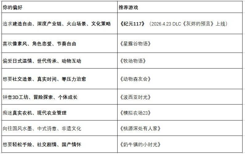 土地从不辜负付出的人。无论你是造景党、效率党还是休闲党,上面五款总有一款适合你。而《纪元117》及其即将上线的DLC《灰烬的预言》,更以活火山五阶段玩法、两倍于最大岛屿的西尼斯大陆岛、黑曜石经济链和新神祇伏尔甘,为种田游戏开辟了“与天灾博弈”的全新维度,不容错过。