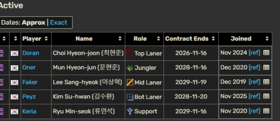 目前T1五名选手的合约上单Doran是签约到26年11月16日,据说还是会续约,但是个短约!打野Oner签到28年11月16日,中单Faker签到29年11月19日,目前Keria也续约到了29年11月16日。而下路Peyz则是签到28年11月20日。当然签约主要还是看是什么选项吧,不过这个阵容要继续保持很久的话,还得看今年世界赛了!
