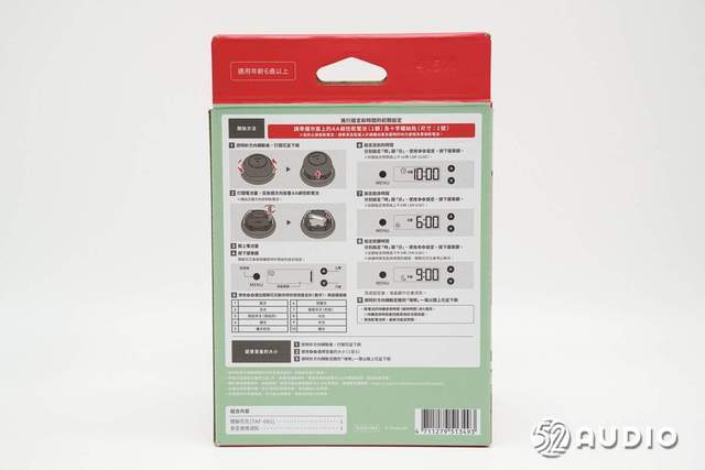 包装盒背面介绍了产品安装电池、设定时间、设定闹钟和睡眠时间的方法,以及支持的语言:英文、法文、西班牙文、德文、意大利文、荷兰文、葡萄牙文、日文、中文、韩文。