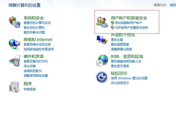 1打开控制面板点击用户账户和家庭安全选项。