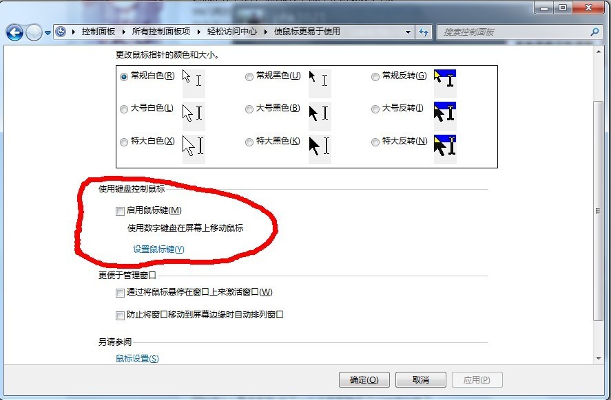 您好,您可以进入控制面板,轻松访问中心,对使用键盘控制鼠标进行设置,
