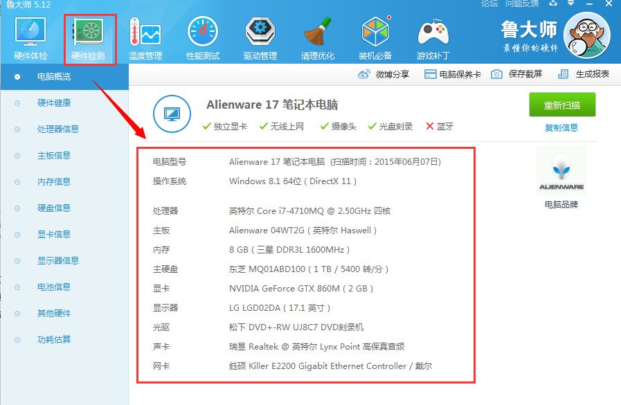 2,双击运行鲁大师,点击“硬件检测”,即可查看各部分型号。