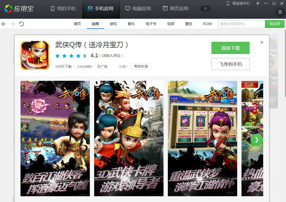 我这边可以正常下载哦,你可以在电脑上的应用宝中下载武侠Q传这款游戏到本地,然后在用QQ或者应用宝飞传到你的手机中,再点击安装即可