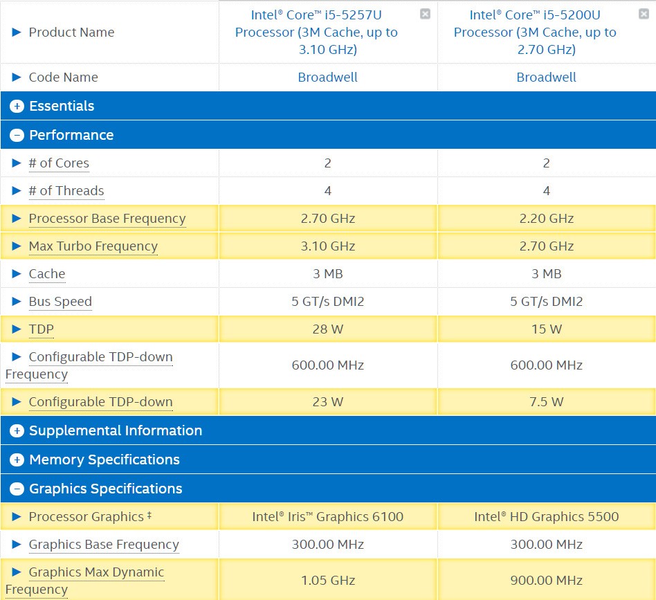 自己看下图,主要区别两个,主频和集成显卡,主频方面5200最大和5257最低一样,集成显卡方面,一个是iris级别,属于同期最强,一个是普通,无论怎么比,都是5257u更好。