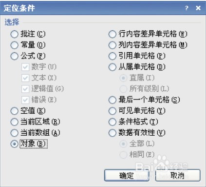 在弹出的“定位条件”对话框中选择“对象”并确定
