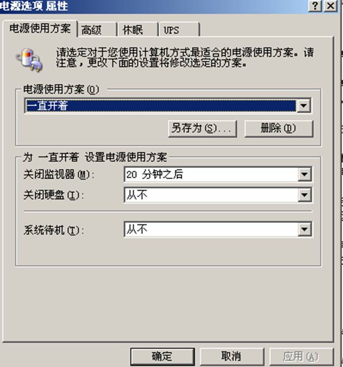 鼠标箭头放桌面空白处-鼠标右键-属性-屏幕保护程序-电源-高级-电源按钮,在弹出的“电源使用方案”中选择“一直开着”,确定