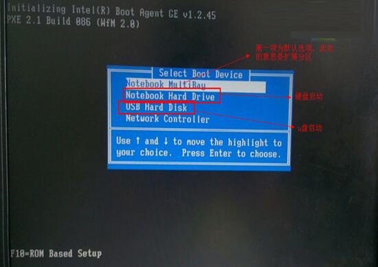 第二步:在电脑启动的时候连续按下键盘上的F9键,进入启动菜单,如下图,选择USB Hard Disk的选项。