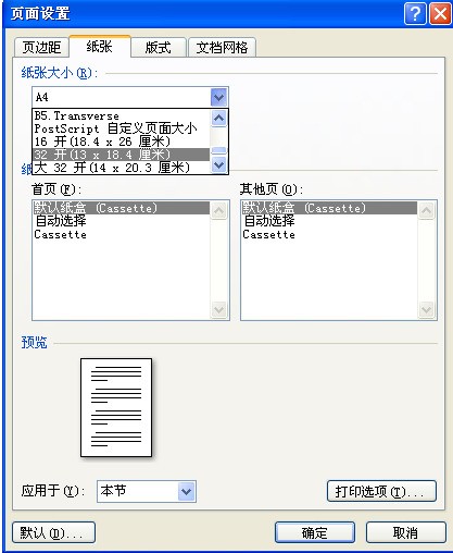 2、弹出页面设置对话框,选择纸张选项卡,在纸张大小处选择32开即可,如图所示。