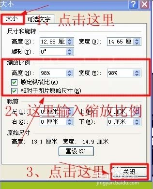 3.在弹出的“大小”对话框中点击“大小”,在里面输入调整后的图片相对于原图片的缩放比例