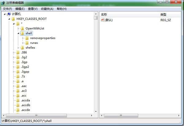 2、打开注册表,打开路径HKEY_CLASSES_ROOT→ * →shell,如下图