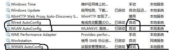 打开控制面板,找到【管理工具】/【服务】,之后对一下三个服务项进行调整。(1)Wired Auto Config (2)WLAN Auto Config (3)WWAN Auto Config 将它们的启动类型全部改为自动,然后注销电脑或重启即可。